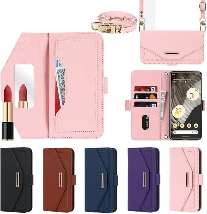 Eastwave for Google Pixel 7 Pro ケース for Pixel7 Pro 縄掛けカバー 手帳型 手帳 for pixel 7pro case チェック柄 鏡 ミラー付き 長ストラップ付き 肩掛け 革レザー 柔らかいTPU 多機能 財布型 カード収納 小銭入 れ スタンド機能 全面保護 5色ピンク