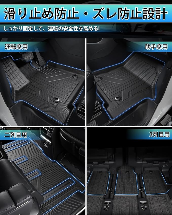 2.セット内容:運転席用 1P、助手席用 1P、2列目用フロアマット 1P、3列目用フロアマット 3P(合計6点セット)※7人乗り、ガソリン/ハイブリッド車対応。※注意事項:年式・グレード・オプション等により適合しない場合が御座います、よく製品形状とお車をご確認頂き、お買い求め下さい。
