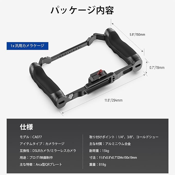 【快適なデュアルハンドル】2つのシリコンハンドルは快適でしっかりとしたグリップを提供し、安定した手持ち撮影を可能にします。カメラケージは高耐久で軽量なアルミニウム合金製を作られており、簡単に操作できます。重量はわずか818gで、最大15kgの荷重を支えます。