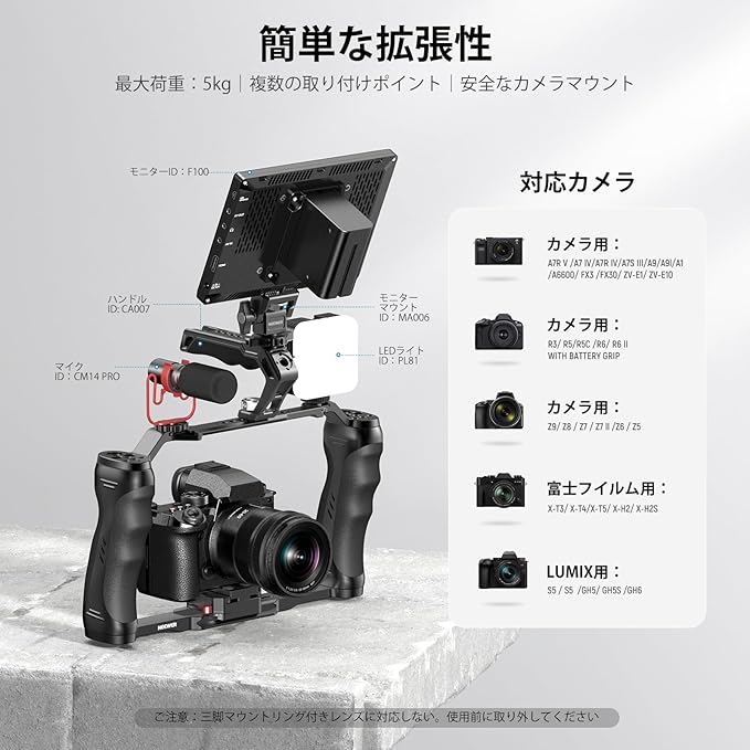 【汎用カメラケージリグ】コンパチブル R100 R50 R8 R6 Mark II R10 R5C A9 A7S A7R A7CR A7C A6700 A6600 ZV-E10 ZV-E1 Zf Zfc Z30 Z9 X100VI X-S20 X-T4 X-T5 X-H2S Lumix GH6 S5 IIX Blackmagic 4K 6Kなど。ご注意:三脚カラーマウントリング付きレンズには適しませんので、ご使用前に取り外してください。