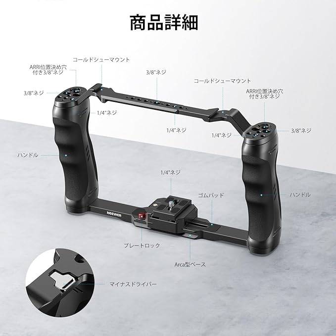 NEEWER ビデオカメラケージリグ Arca型クイックリリースプレート/デュアルグリップ/3/8"ARRI位置決め&1/4"ネジ/コールドシュー付き 汎用カメラスタビライザー コンパチブル スモールリグ NEEWERベースプレート CA077
