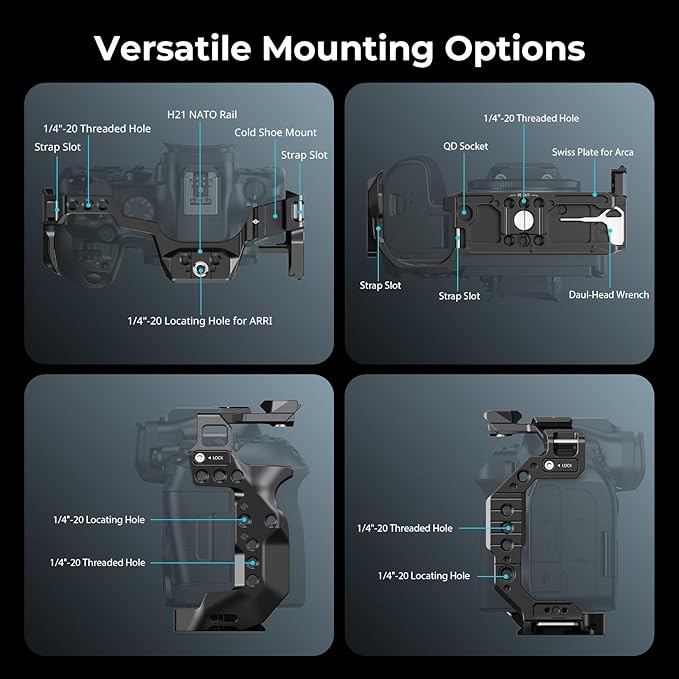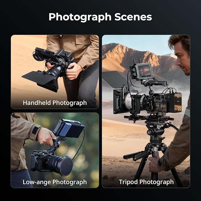複数の拡張インターフェース:1/4インチ-20ネジ穴、ARRI、コールドシューマウント、QDソケット、ストラップスロット用の3/8インチ-16のロケーションホールがあり、多様な撮影シナリオをサポートします。