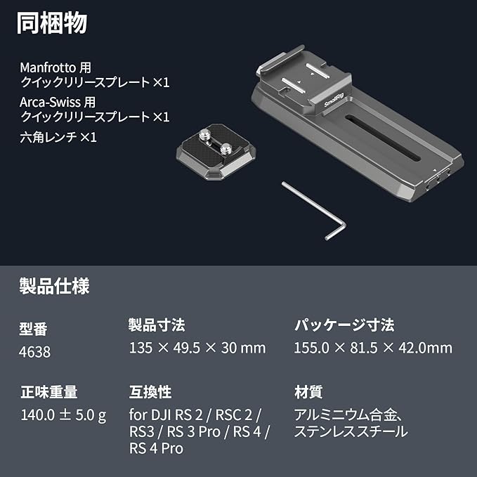【DJIジンバル用】SmallRigクイックリリースプレート(Manfrotto4638用) は、DJI RS 2/RSC 2/RS3/ RS 3 Pro/RS 4/RS 4 Pro用に特別に設計されています。