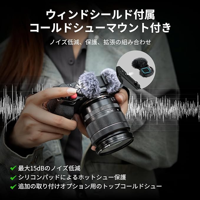 【コールドシューマウント付きウインドシールド付属】コールドシューマウントを内蔵したウインドシールドが付属しており、風切り音を 15dB 低減します。底部にシリコンを内蔵し、ホットシューの傷を防ぎます。