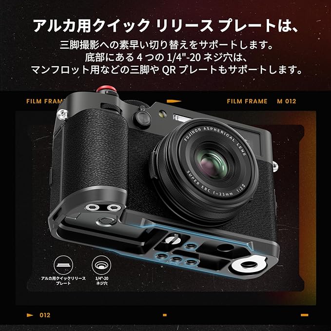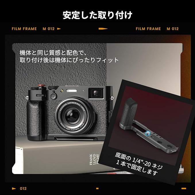 【互換性】 この L 字型ハンドルは、FUJIFILM対応 X100VI および X100V カメラ用にカスタム設計されています。ハンドグリップは、底部にある1/4インチ-20 ネジ 1 本で固定します。カメラ本体の質感と配色にマッチし、取り付け時にシームレスにフィットします