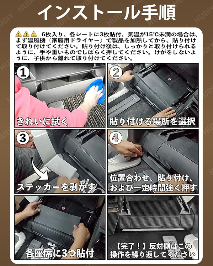【工具不要の簡単取り付け】①取り付け位置を綺麗に拭いてください ②商品裏面の両面テープの離型紙を剥がし、位置合わせして貼り付ける ③しっかりと押し付けて密着させるだけで完成です。表面の汚れは柔らかい布で拭くだけで簡単に落とせます。もし装飾ストリップにしわができたら、熱風ブロワーで温めるだけで平らに整えられますよ。