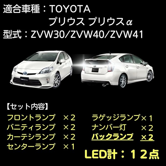 【室内灯+ナンバー灯+バックランプ】プリウス LED 12点セット 型式:30/40系 取付工具付き 【簡単交換】 無極性 6000K ゴースト灯防止 室内灯 パーツ カー用品 カスタム 各グレード PRI(30/40)02