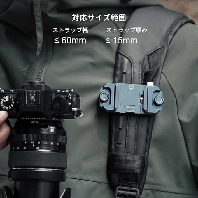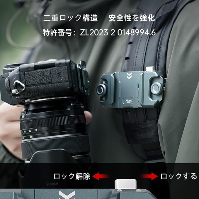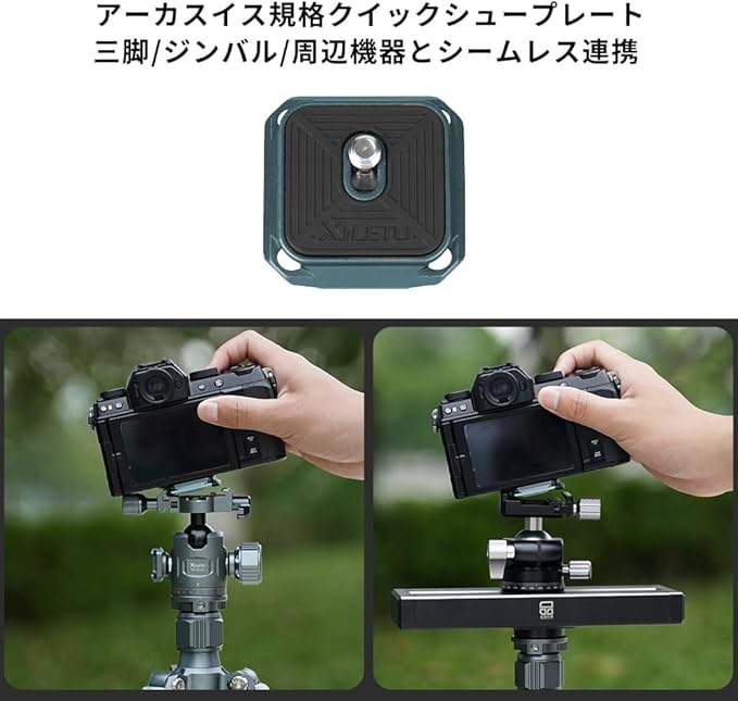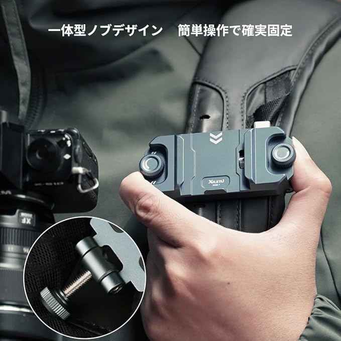 【XQD1クイックリリースシステム】:XILETUはクイックリリースシリーズを開発し、カメラとアルカスイス対応できクイックリリースプレートの装着状態で、カメラホルスターとショルダーストラップの間に、素早く切り替えることを実現します。カメラと三脚&雲台の間にクイックリリース化して脱着の手間が大きく省けます。