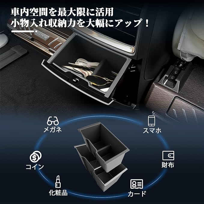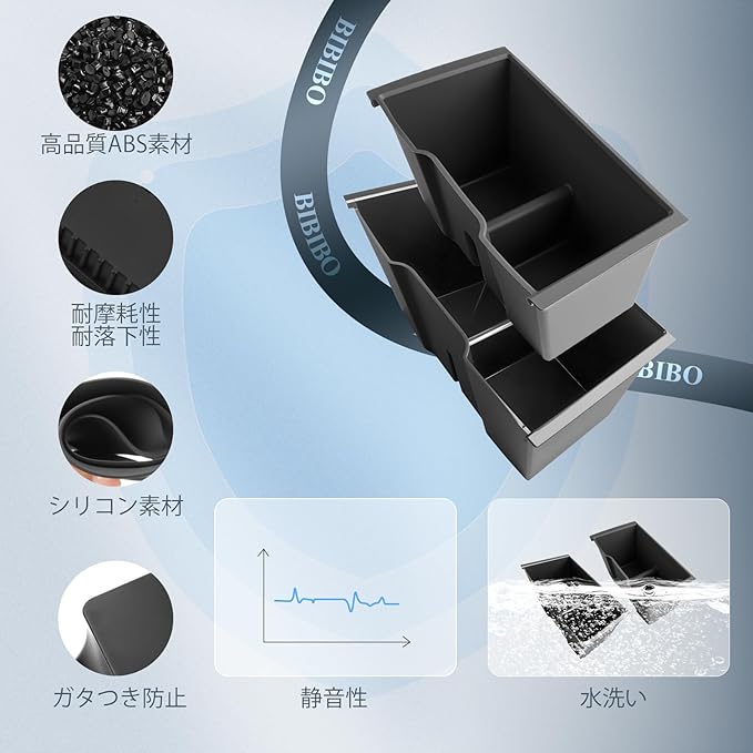 【防水性、滑り止め、無音】アルファード40系専用収納ボックスは、水洗いできる素材を採用しており、汚れても簡単にお手入れできていつでも清潔。底面は滑り止め加工を施したゴム素材で、小物が走行中に滑ったりカタついたりする心配もなく、静かで快適な車内空間を保ちます。
