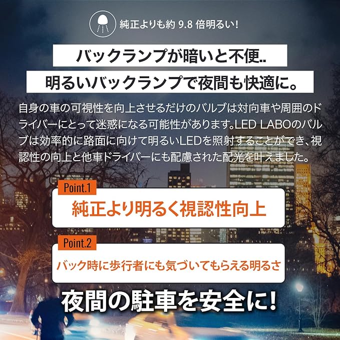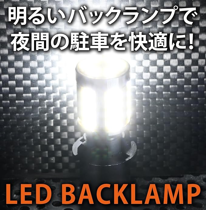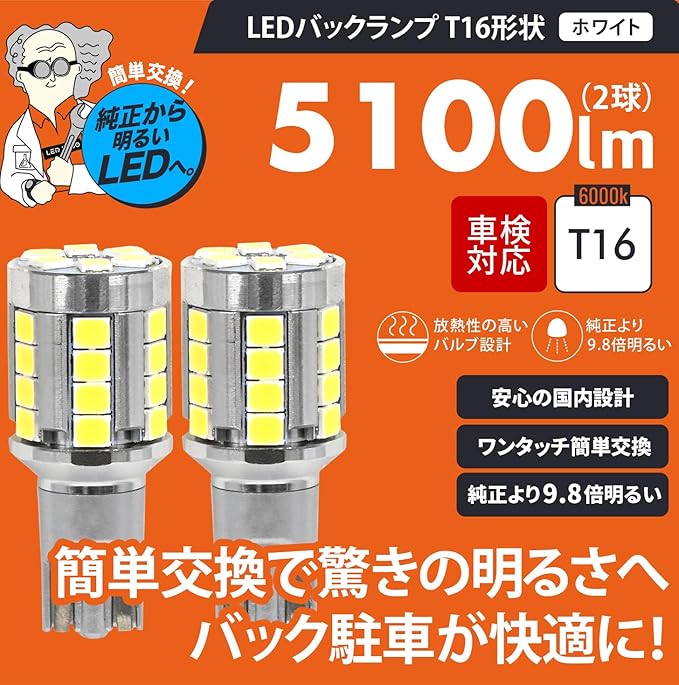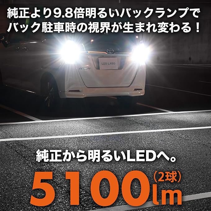 T16形状バックランプです。 自社で計測した5100lmのかなり明るい爆光バルブです。 バックランプをLEDにすることで瞬時に点灯。 視認性がアップし、周囲に存在をアピール。 事故を予防します。