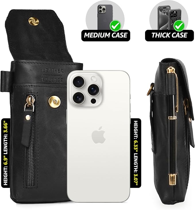 レザービレッジ本革 7インチ x 3.5インチ 携帯電話ホルスターポーチ ベルトクリップとマグネット開閉式 IDカードホルダー付き - iPhone、Samsung Galaxy、Google Pixel用 ブラックユニバーサルケース