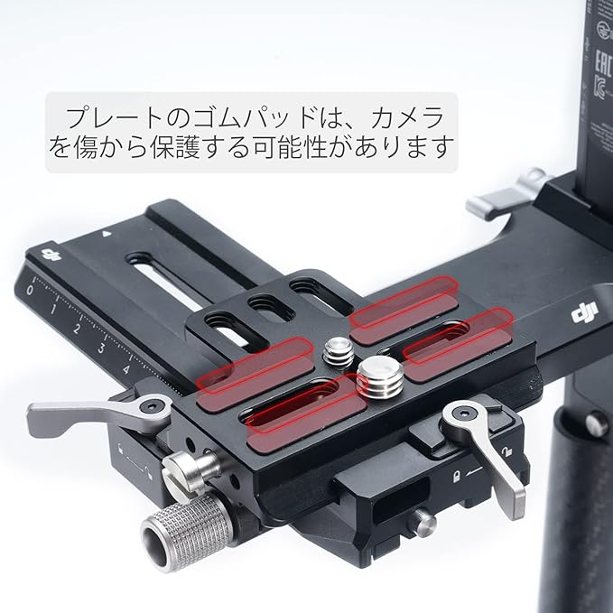 【追加のセキュリティ】ラバークッションと2本のネジでカメラを安全に保ちます。この拡張クイックリリースベースプレートは、既存のDJI RS 2ベースプレートに取り付けられ、より重いカメラやより大きなカメラのセットアップに、より広く、より安全なベースを提供します。