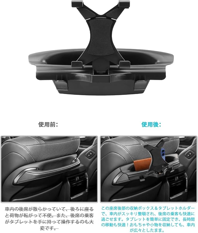 2.【収納&ホルダー一体型】車の座席後ろに取り付け可能な収納ボックスとタブレットホルダー。後部座席の空間を有効活用し、小物の整理整頓ができます。さらに、便利な大きなタブレットホルダー付きで、長時間のドライブ中でも後部座席の乗客が快適に動画や映画を楽しめます。収納とスタンド機能を兼ね備えた一石二鳥のアイテムで、車内をより快適に!