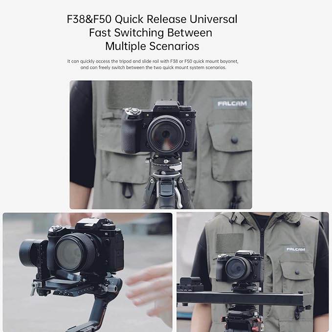 [F38 F50 クイックリリース ユニバーサル 複数のシナリオ間での高速切り替え]F38 または F50 クイックマウントバヨネットを使用して三脚とスライドレールにすばやくアクセスでき、2 つのクイックマウントシステムシナリオを自由に切り替えることができます