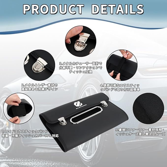 【専用ロゴ】この車用ティッシュケース表面は ALPHARD 専用ロゴが印刷されており、ご愛車に合わせやすい洗練なデザインが特徴です、車内に高級感を与えます。アルファード 車のカスタムパーツおしゃれ。