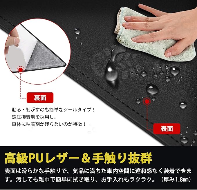 3.【高級PUレザー&手触り抜群】車内雰囲気に溶け込みやすいブラック、また表面は滑らかな手触りで、気品に満ちた車内空間に違和感なく装着できます。汚しても雑巾で簡単に拭き取り、お手入れもラクラク。また、耐摩耗性および耐久性に優れる高級PUレザーを採用し、厚み1.8㎜の高密度でクッション性が高く、車体に優しいです。