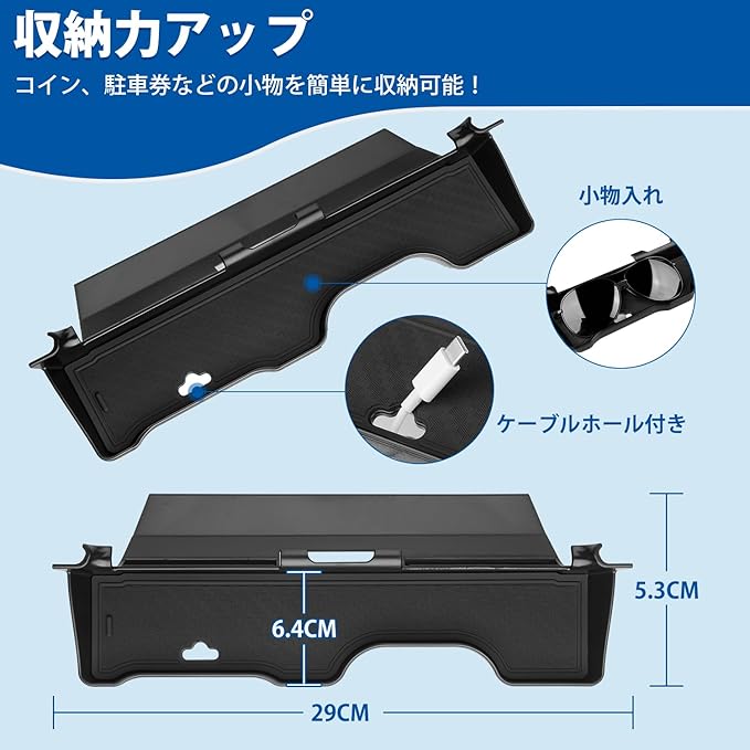 3.【ケーブルホール&収納力UP】:製品にケーブルホールが付き、スマホを充電しながら置くだけで収納可能!充電にも干渉しない!なお、車内の限られたスペースを最大限に活用できる収納アイテム!駐車券、スマートフォン、メガネ、鍵などのよく使う小物を効率的に収納できます。