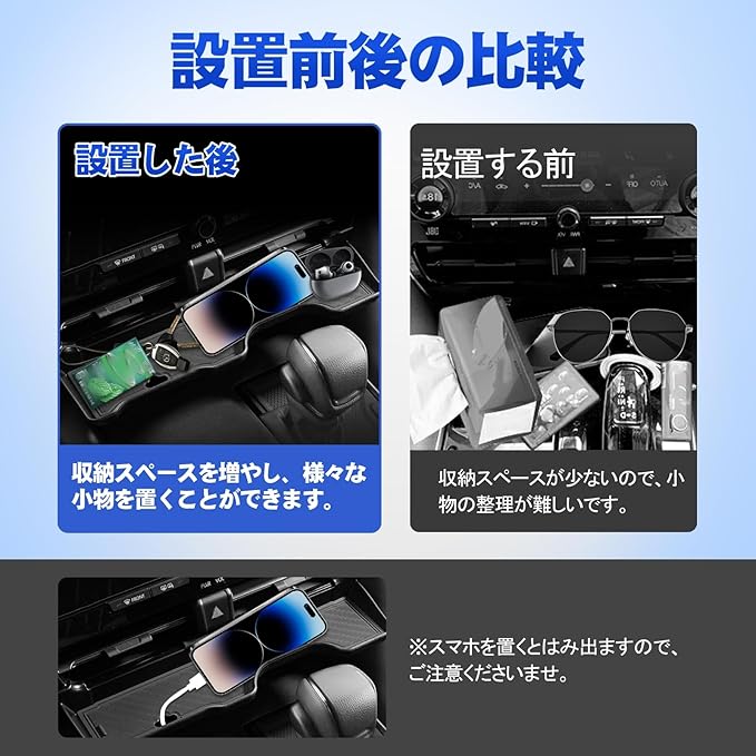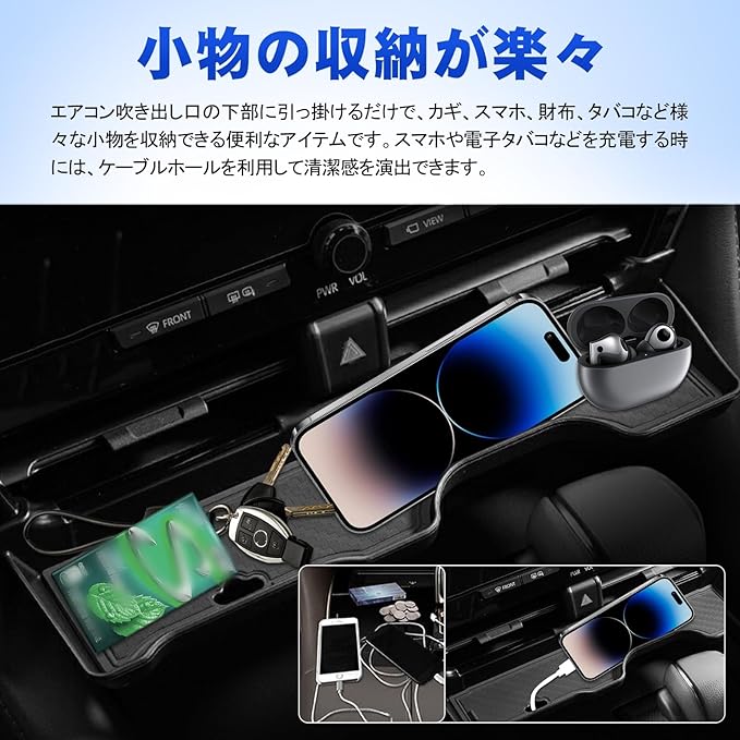 【小物の収納が楽々】エアコン吹き出し口の下部に引っ掛けるだけで、カギ、スマホ、財布、タバコなど様々な小物を収納できる便利なアイテムです。スマホや電子タバコなどを充電する時には、ケーブルホールを利用して清潔感を演出できます。