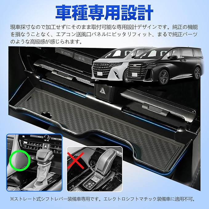 【適合車種】アルファード 40系 R5.6~、ヴェルファイア 40系 R5.6~。ストレート式シフトレバー装備車専用。※ガソリン車とハイブリッド車で判断するのではなく、シフトレバーの形状で判断してご購入お願いいたします。