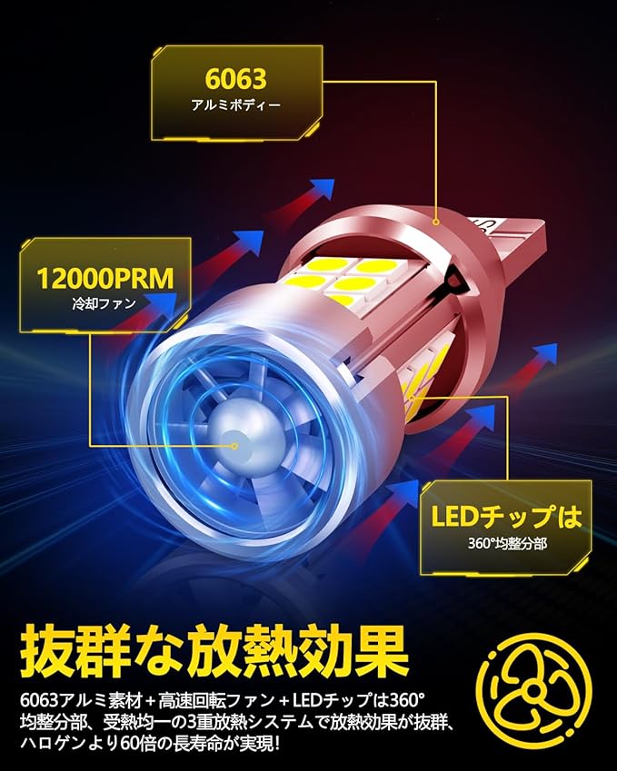 【長寿命化&優れた放熱性】最初のファン付きバックランプ設計。12000PRM高速回転ファンを付いており、高熱伝導6063アルミ材質を採用しており、 LEDチップ360 均整分部、受熱均一で、優れた熱伝導性・放熱性を実現します。発熱量をしっかり抑え、灯体への負担をかからず、60000時間の使 用寿命を実現します。
