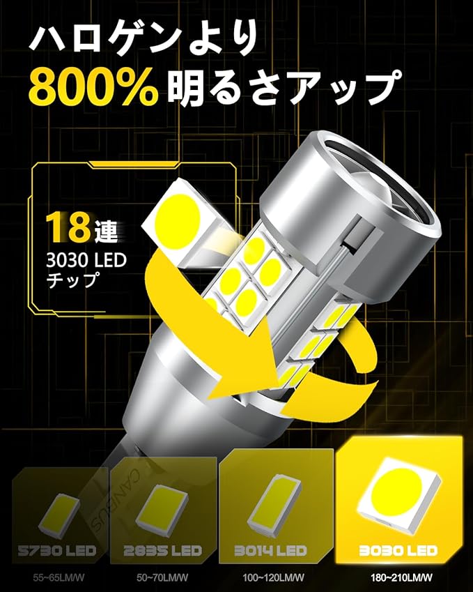 【明るさヘッドライト級のバックランプ】高発光効率の18連3030LED 高輝度チップを搭載し、爆発的な明るさを実現しました。LEDだから光が鮮やかに輝いて、視認性抜群です。純正電球と交換するだけで明るさが8倍アップ。ムラ のない360 全方向拡散を実現します。ヘッドライト程の明るさで車両後方をより遠くて広く照射可能で、暗い 場所でバックカメラから後方をはっきり見え、後部の不慮の事故などを防ぎ、安全性が大幅に向上されます。※ 本製品は12V専用です