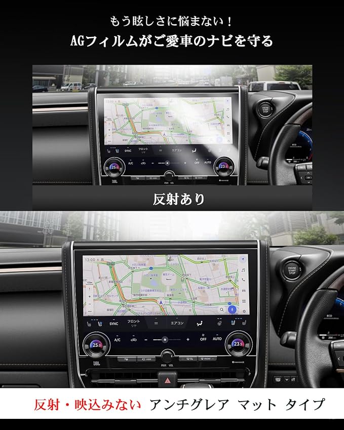 【もう眩しさに悩まない!AGフィルムがあなたのナビを守る】アルファード40系 AG防反射膜は、強い日差しや車のヘッドライトによる眩しさを効果的に軽減することで、40アルファード運転中の安全性を大幅に向上させます。アルファード40系 ナビ 保護フィルムは、光を均等に散乱させる特殊な磨砂加工が施されており、強い光が直接画面に反射するのを防ぎます。結果として、40系アルファードナビゲーション画面はいつでもクリアに見え、運転中の情報確認が容易になります。ドライバーがより快適に、そして何よりも安全に運転に集中できる環境を提供します。