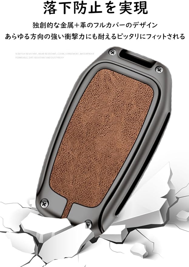 【高級な素材】キーケースは良質のアルミ合金と本革素材を採用します。(本体は光沢があり高級感があります◆ハイクラスでラグジュアリー感あるキーケースです)。キーケースのボタン部分は革を採用して、レトロなデザインがキーケースをより高級に見せてくれます。人の目を引くことができます。そして防塵、耐衝撃、高級感ある仕上がりとなっています。傷、汚れ等から大事なスマートキーを守ることができます。キーカバーは電波遮断しない中空の設計を採用され、信号には邪魔しない。