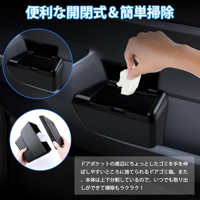 2.【片手で開閉可能】ドアハンドルの周辺にちょっとしたゴミを手を伸ばしやすいところに捨てられるドアゴミ箱。また、本体は上下分割しているので、いつでも取り出しができて掃除もラクラク!
