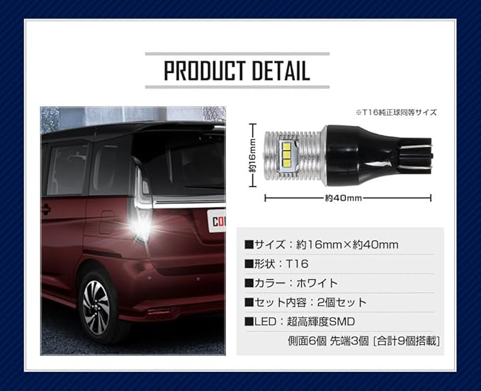 ソリオ ソリオバンディット 専用 T16 LEDバックランプ 45W 2個セット 【圧倒的な光量で後方視認性を向上】超爆光45W 560LM:超高輝度SMD LEDを9基(側面6個・先端3個)搭載。純正球を凌ぐ高い光量を実現。