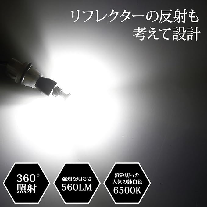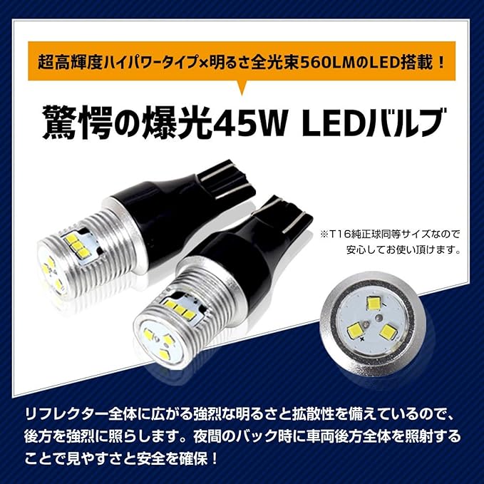 ✅ 超爆光45W・560LMで後方視認性アップ:超高輝度SMD LEDを9基(側面6+先端3)搭載。純正球を大きく上回る明るさで、夜間や暗所でのバック時も安心感を高めます。