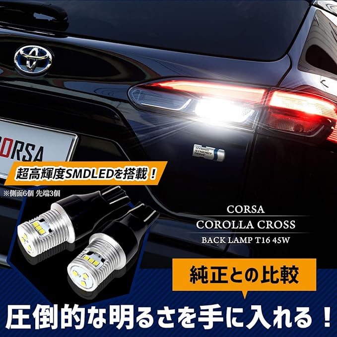 カローラクロス専用 T16 LEDバックランプ 45W 2個セット 【後方視認性をサポート】45W 560LM:高輝度SMD LEDを9基(側面6個・先端3個)搭載。