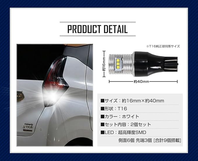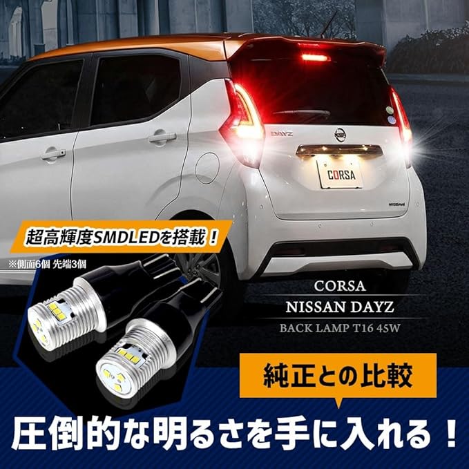 ニッサン デイズ 専用 T16 LEDバックランプ 45W 2個セット 【圧倒的な光量で後方視認性を向上】超爆光45W 560LM:超高輝度SMD LEDを9基(側面6個・先端3個)搭載。純正球を凌ぐ高い光量を実現。