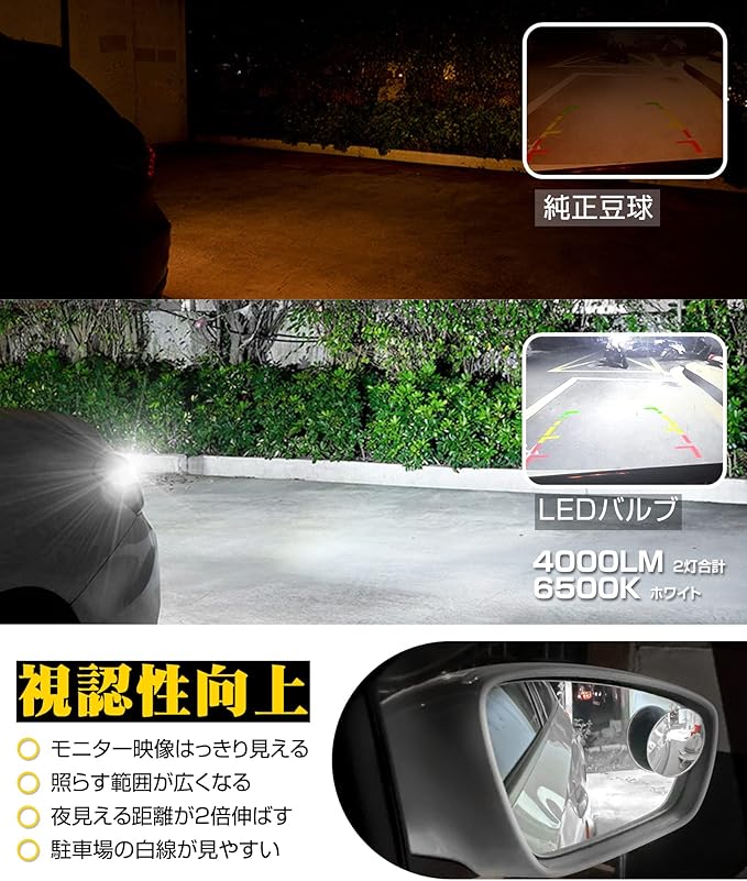 ■3600LM超高輝度:後退灯専用高品質LEDチップ、死角のない360度全方位照射仕様。バック時の視野は純正より大幅広くなる、後方の障害物をはっきり見える(車検対応1800LM*2灯)。