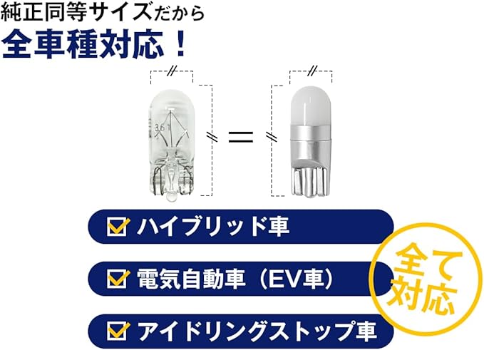 【純正同等サイズで汎用性抜群】 T10純正球と同等のコンパクトなスリム設計により、ポジションランプやルームランプ、ナンバー灯、カーテシなど、車種を選ばずあらゆる箇所へのLED化を実現します。ハイブリッド車、EV、アイドリングストップ車にも対応した最新仕様。定番のホワイトやアンバーに加え、HIDと相性の良いウォームホワイトなど全7色の豊富なラインナップを展開しており、愛車のトータルコーディネートを妥協なく楽しむことが可能です。
