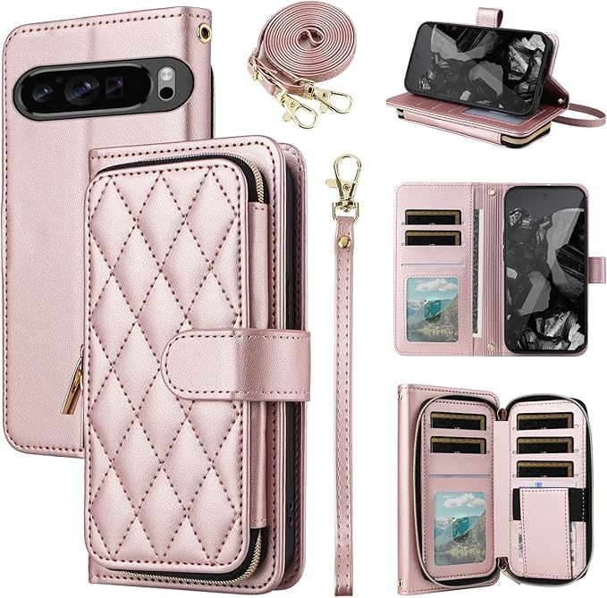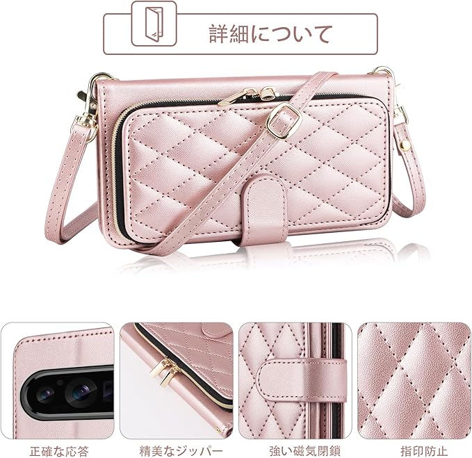 Elisorli for Google Pixel 9 Pro XL 手首/ショルダーストラップ カードスロット ジッパー財布 豪華 PUレザー スタンド ための 携帯電話のカバー 持つ Pixel9 9Pro 9ProXL Nine ウォレットケース しい 大人人気 お洒落 ケース 手帳型 スマホケース カバー スマートフォン 耐衝撃 フラップ ストラップホール カード収納 女 ローズゴールド