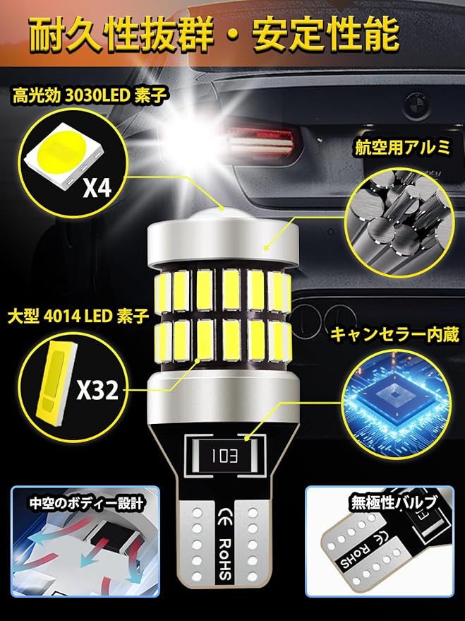 【キャンセラー内蔵】本製品12V車用になり、国産車専用キャンセラー内蔵で大部分車種はエラーフリー、簡単に使用可能。(輸入車はキャンセラーできないこともあります。)定電流回路を搭載しており、車両の電圧変動に影響されることなく、安定した明るさを持続します。ほとんどの車種において、エラー表示が発生しない設計です。適合ソケット:T16、T15、912、921、906、904、902。