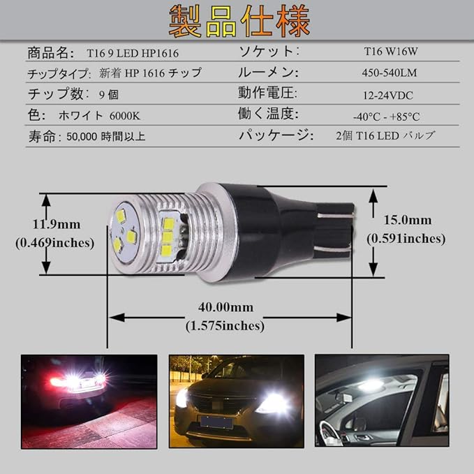 【2個T16 LED バックランプ】9連HP1616LEDハイパワーチップ搭載;電圧:12V-24V;ベース:爆光 ホワイト 6000K