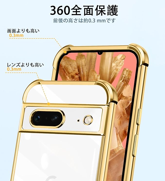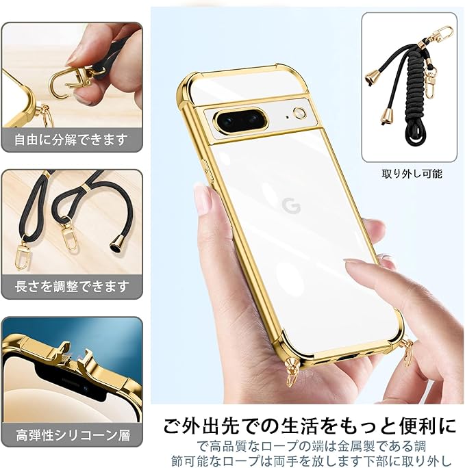 Pixel 8 ケース クリア ショルダー 耐衝撃 グーグル ピクセル 8 スマホケース 薄型 TPU 軽量 肩がけ 首掛け 紐付きバンパー カバー ストラップ付き ストラップホール付き 韓国 透明 ストラップ着脱可 調節 ワイヤレス充電 全面保護 落下防止 すり傷防止 カメラ保護(ゴールド)