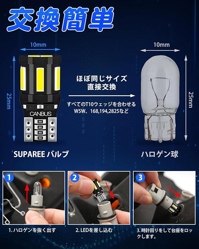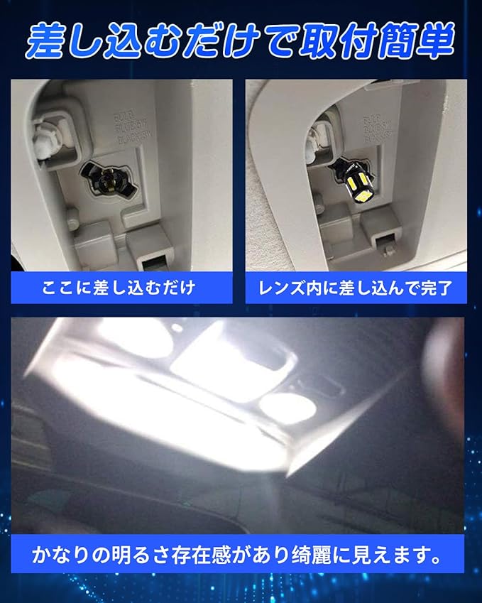 【汎用バルブ&取付簡単】無極性タイプなので差し込み方向を気にせずご使用可能です。ルームランプ / ナンバー灯 / カーテシランプ / ポジションランプ / トランク灯 / クリアランスランプ / テールランプ/スモールランプなど、T10が使用されている箇所で付けできます。