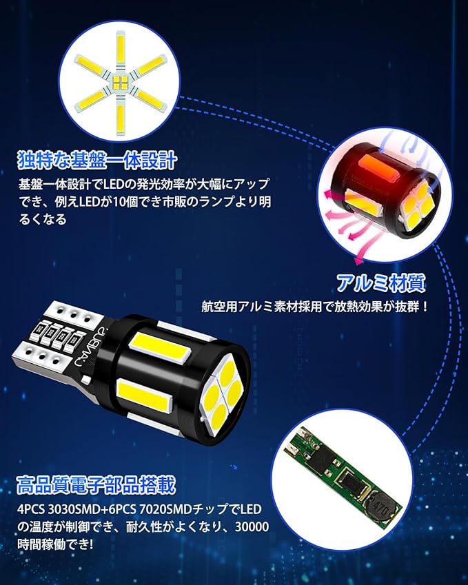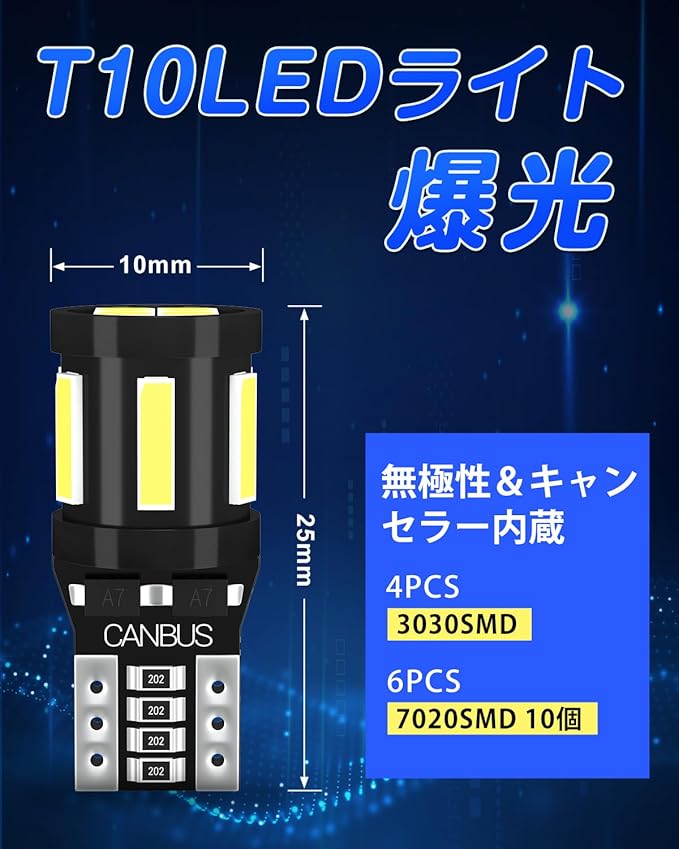 【セット内容】T10 LED バルブ*4個 4PCS 3030SMD+ 6PCS 7020SMDを採用し、360 全方位照射でき、キャンセラー内蔵で大部分の車種に適用します!