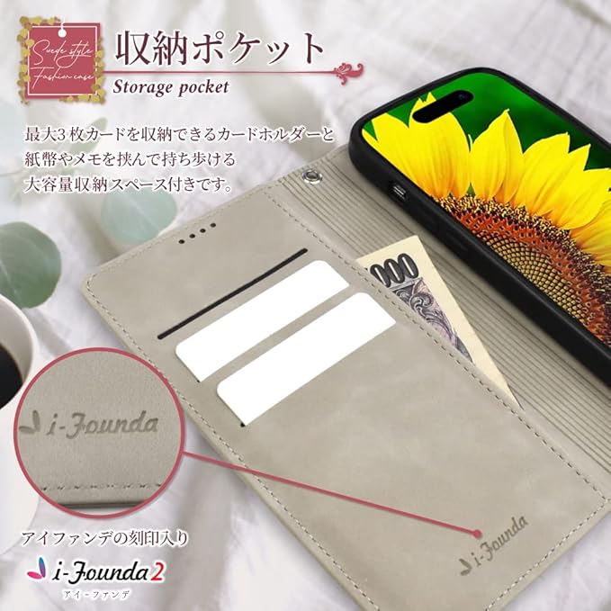 【iFounda2ケースの特徴】 深みのある色合いので、落ち着いた印象を与えます。 フェイクスエードを使用している為、肌ざわりよく手にフィットします。 また、耐久性もあり丈夫な仕上がりとなっております。