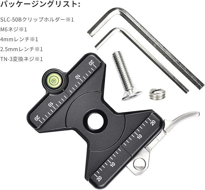 ✪パッケージングリスト:SLC-50B クリップホルダー※1、M6ネジ※1、4mmレンチ※1、2.5mmレンチ※1、TN-3変換ネジ※1、R04パイルバック※1