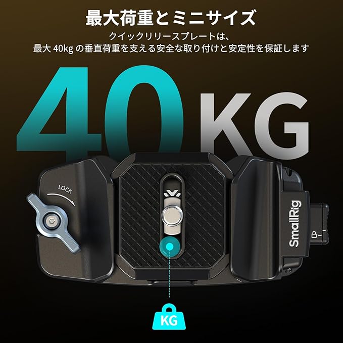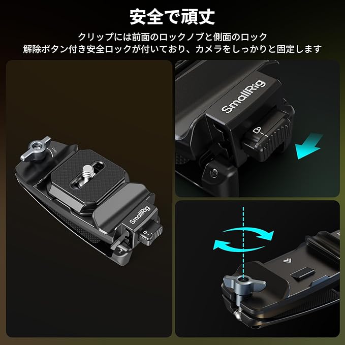 【安全で頑丈】クイックリリースプレートは安全な取り付けと安定性を確保し、最大40kgの垂直荷重に耐えます。クリップには前面のロックノブと、ロック解除ボタン付きの側面安全ロックが装備されており、カメラをしっかりと固定します。