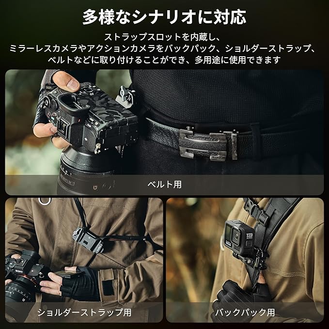 【マルチシナリオ互換性】内蔵ストラップスロットは、ミラーレスカメラやアクションカメラをバックパック、ショルダーストラップ、ベルトなどに取り付けることができ、多用途に使用できます。