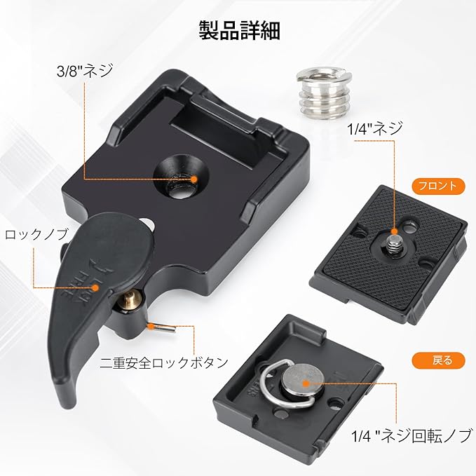 クイックリリースプレートは、1/4" ネジと底面の回転ハンドルを使って手動で調整でき、カメラやフラッシュに接続できます。底面の3/8" ネジ穴には、1/4" から 3/8" ネジ アダプタやその他のデバイスに接続します。