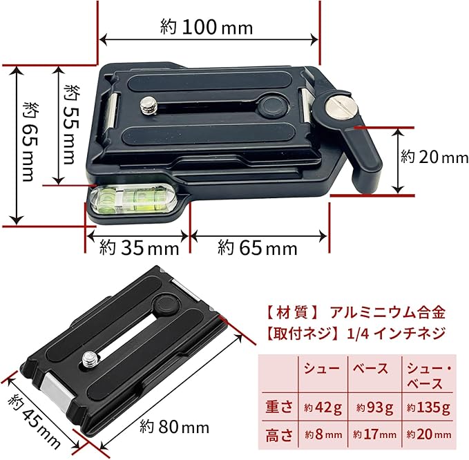 【材質】アルミニウム合金【取付ネジ】1/4インチネジ【サイズ】約100mm 約65mm 約20mm【重量】①シュー・ベースセット:約135g②シューのみ:約42g③ベースのみ:約93g【カラー】ブラック【バリエーション】①シュー・ベースセット②シューのみ③ベースのみ