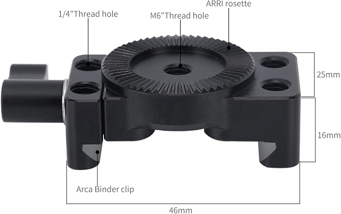 ARRI M6 スレッド ロゼット グリップ、オプションの Niceyrig ロゼットハンドル 424/149、Niceyrig 255/252 と互換性があります。 クランプ上部に複数の 1/4''-20 ネジ穴があり、ライト、マイクなどアクセサリを取付できます。