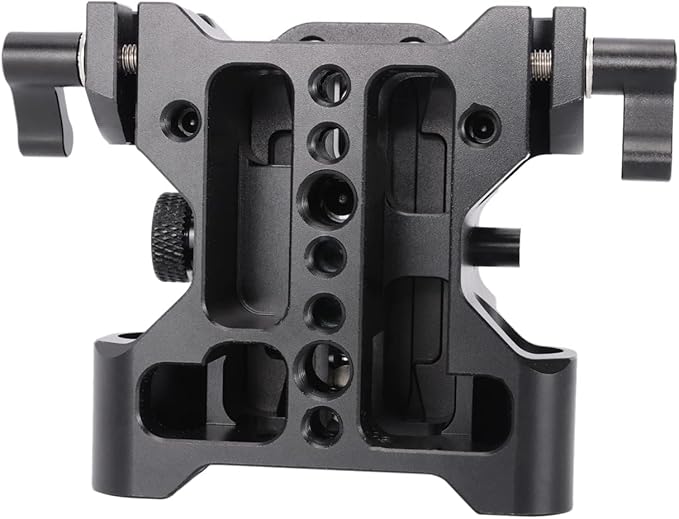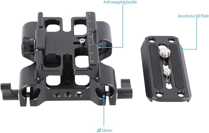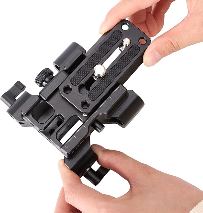 【15mmロッドシステム対応】 このベースプレートは15mmロッドクランプ付きで、二つのパイプの距離が60mmで、ビデオリグなどの動画機材では一般的な15mm規格のロッドに装着できます。それにより、フォロウフォーカスやマットボックスのようなアクセサリーをロッドシステムの上に取り付けることが出来ます。