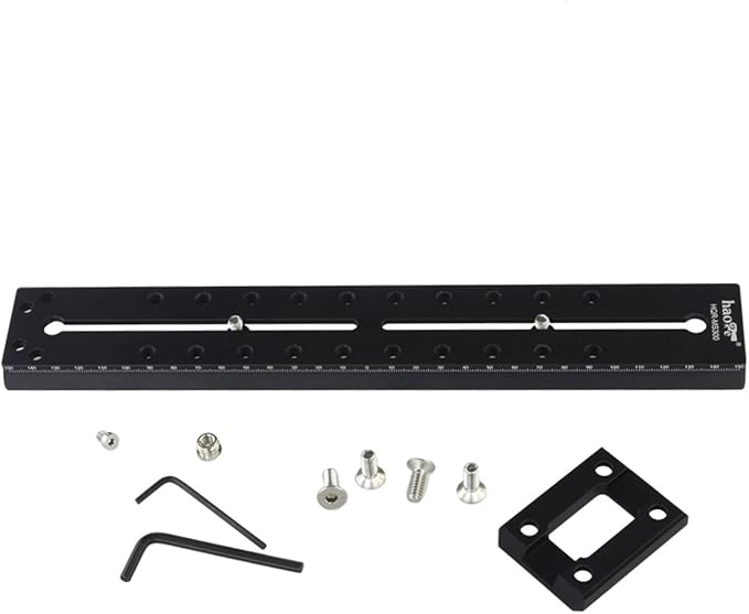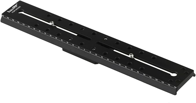 Haoge HQR-MS300IIロングバージョンのクイックリリースプレートは、Sachtler対応の多目的レールで、両側に1mm刻みのレーザー刻印された参照スケールが付いています。 8つの異なる場所に底板を取り付けるためのUNC1/4ネジ山20本。