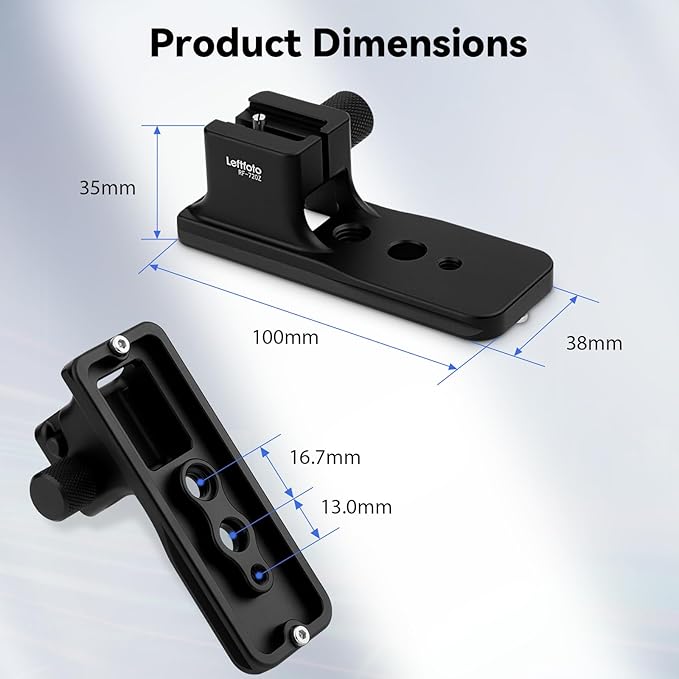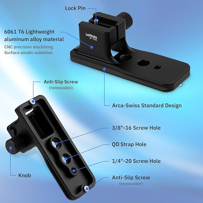 【安定性と保護】- レンズカラー交換用ベースには、1/4インチと3/8インチのネジ穴があり、底部にステンレススチール製の滑り止めネジが付いています。クイックリリースシステム用のQR穴付きで、屋外での撮影に適した持ち運び方法を提供します。